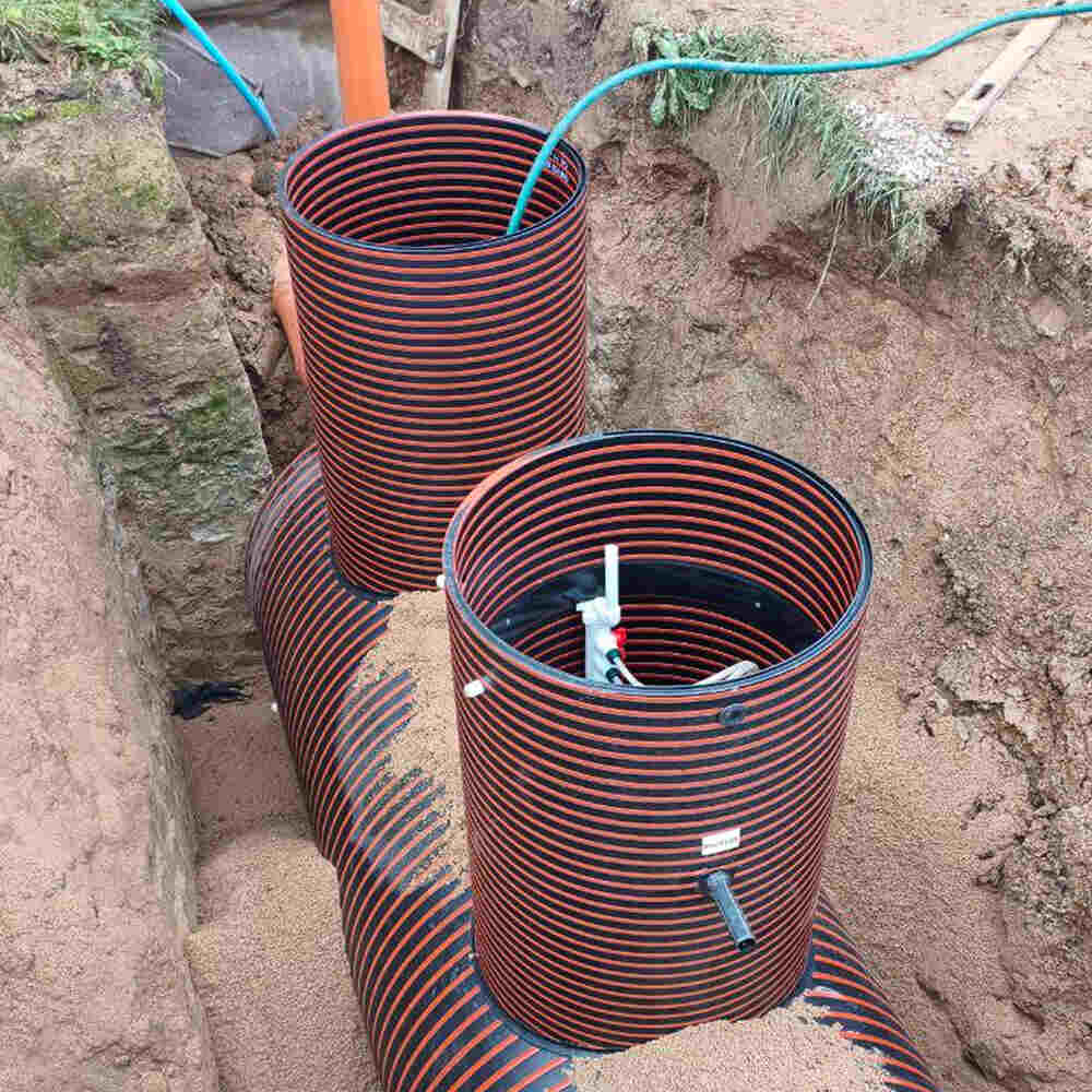 Корпус выполнен из полиэтиленовой спиральновитой трубы, изготовленной по высшим международным стандартам с соответствующими сертификатами качества. Материал корпуса - полиэтилен марки ПЭ100, самый прочный на сегодняшний день из всех ПЭ полимеров. Толщина корпуса составляет 25 мм. Материал станции устойчив к низким и высоким температурам, что позволяет при монтаже станции делать обратную засыпку песком и эксплуатировать в любых климатических условиях. Монтаж становится еще проще и дешевле. Обратная засыпка станции цементно-песчанойесью теперь не нужна!
