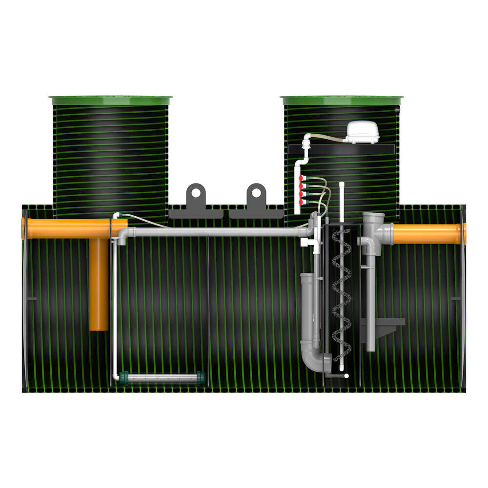 Как и 95% всех станций очистки хоз. бытовых стоков, которые есть на рынке СНГ, принцип работы данного септика основан на мелко-пузырчатой аэрации, которую создает аэратор (компрессор, воздуходувка) поставляемый в комплекте станции. Поэтому, все септики, которые работают по данному принципу являются энергозависимые. За счет подачи воздуха, а так же за счет дополнительных механизмов очистки (аэрлифты, жироуловитель, иловый отстойник, сотовая биозагрузка, ершовая загрузка) происходит полная очистка хоз. бытовых стоков до уровня технической воды. Степень очистки станции при идеальных условиях достигает 98%. Вода на выходе не имеет запахов, абсолютно прозрачна и бесцветна. Такую, экологически чистую техническую воду можно достаточно долгое время дренировать в грунт, а так же использовать в качестве воды для полива, мойки и т.д. Данная станция подходит как для постоянного проживания, так и для сезонного (например, дачного варианта). Вопреки всем мифам, в станцию не нужно добавлять никаких бактерий! Процесс очистки полностью автономный.