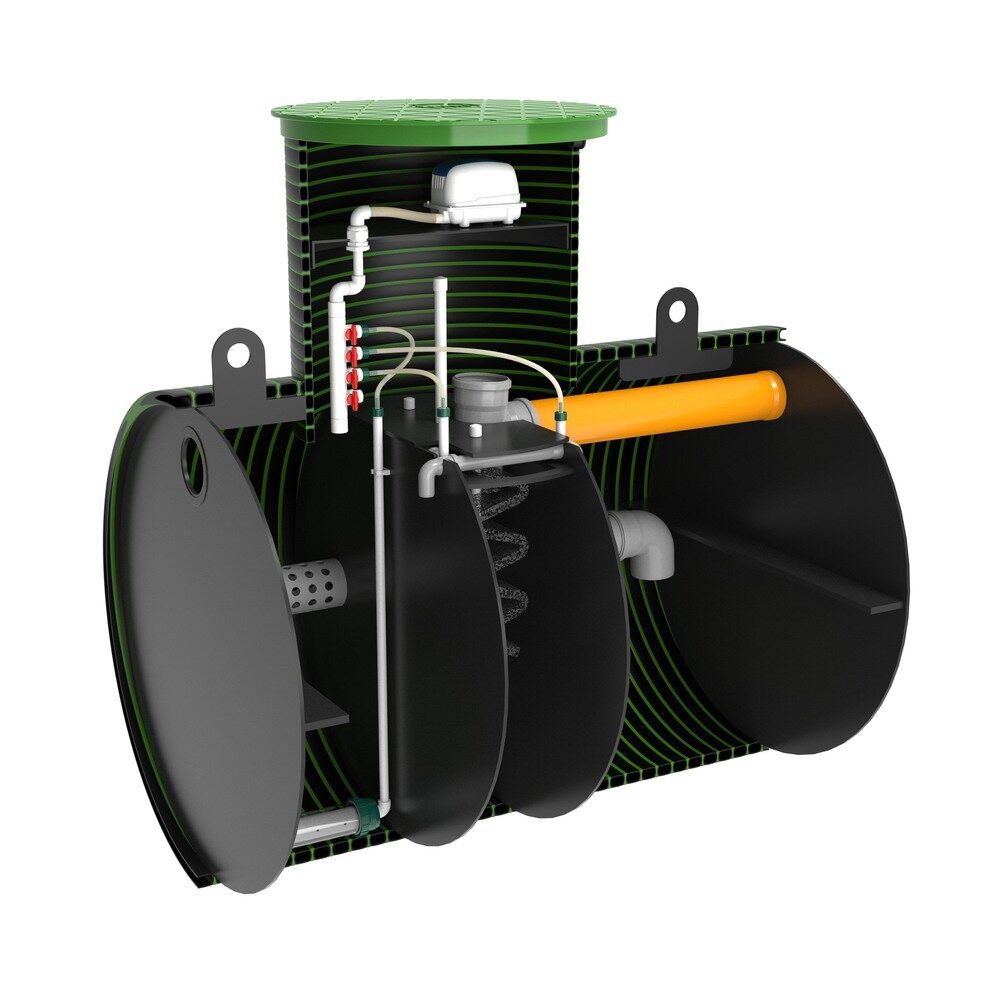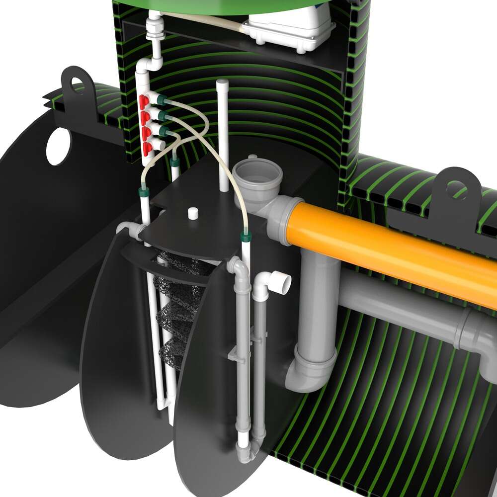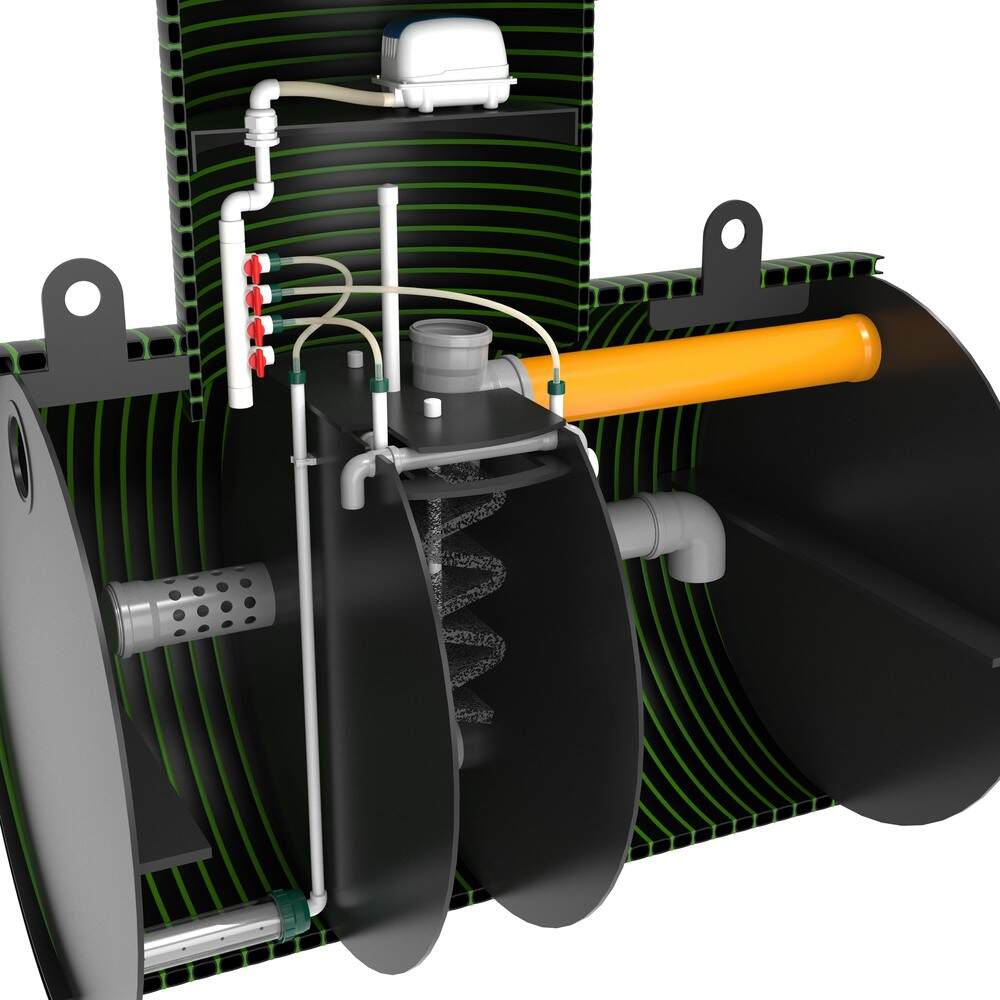 Принцип работы данного септика основан на мелкопузырчатой аэрации, которую создает аэратор (компрессор, воздуходувка), поставляемый в комплекте станции. За счет подачи воздуха в станцию, а также за счет дополнительных механизмов очистки происходит полная очистка хоз. бытовых стоков до уровня технической воды биологическим способом. Степень очистки станции при идеальных условиях достигает 98%. Вода на выходе не имеет запахов, абсолютно прозрачна и бесцветна. Такую, экологически чистую техническую воду можно достаточно долгое время дренировать в грунт, в канаву, дренажный колодец, в поле фильтрации. Вопреки всем мифам, в станцию не нужно добавлять никаких бактерий!