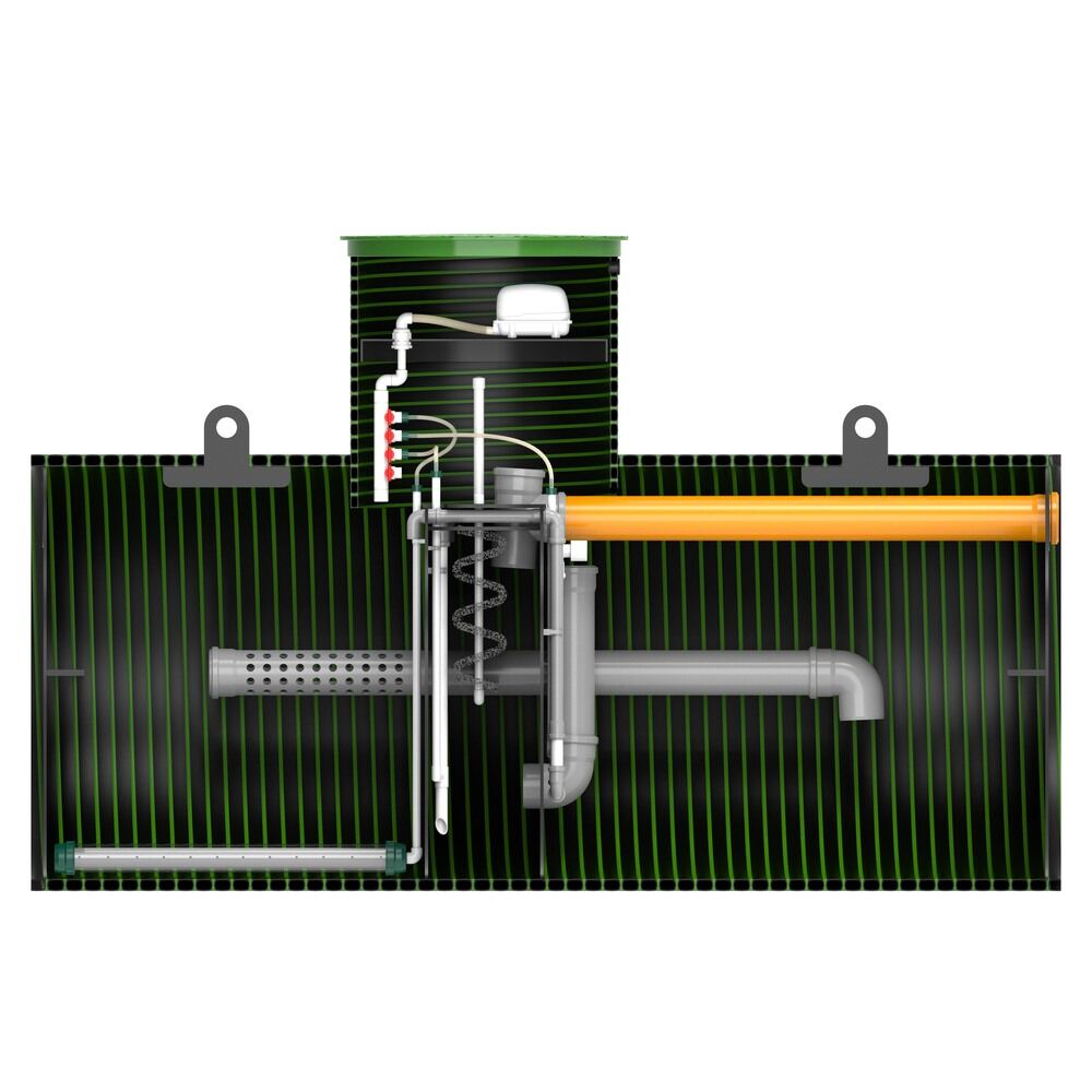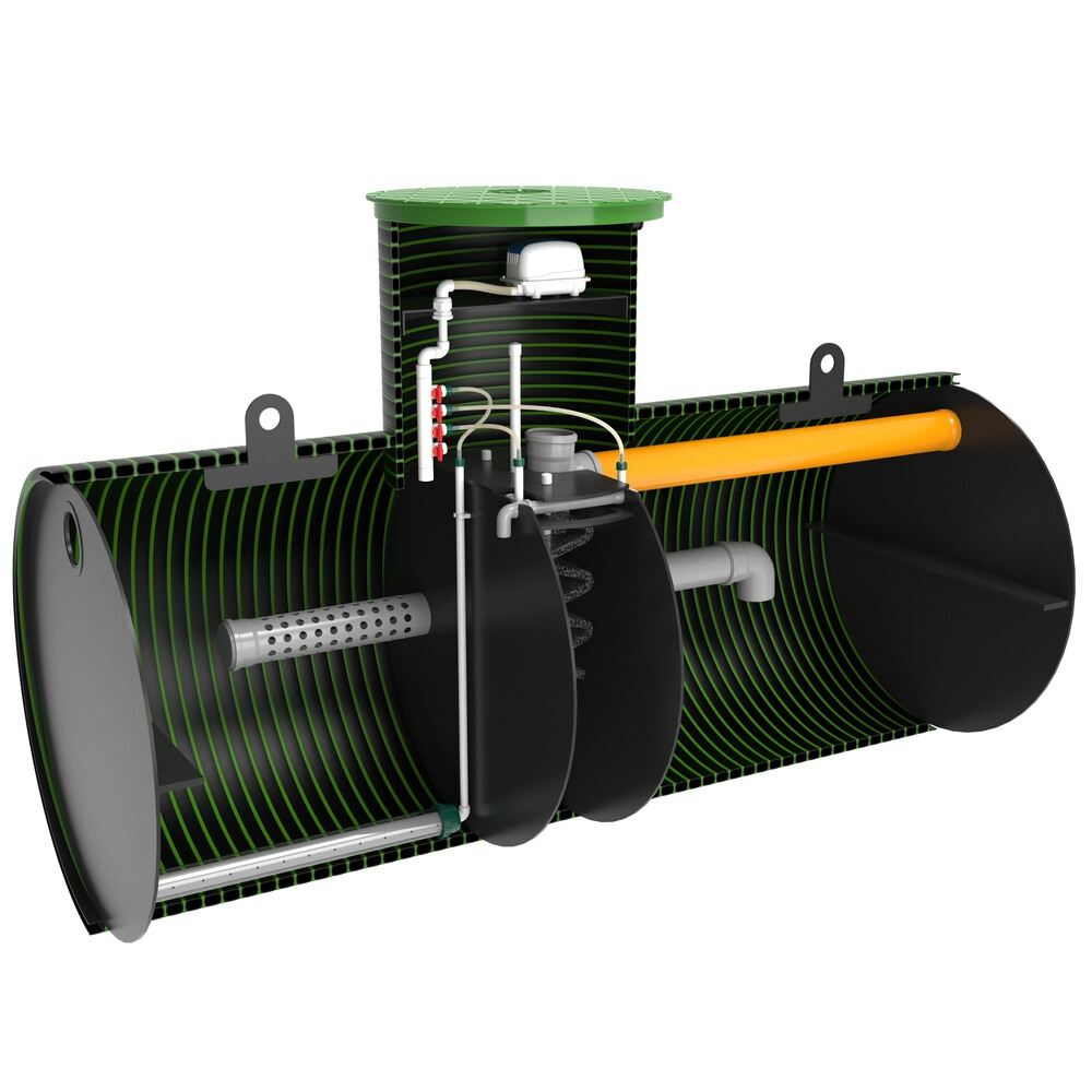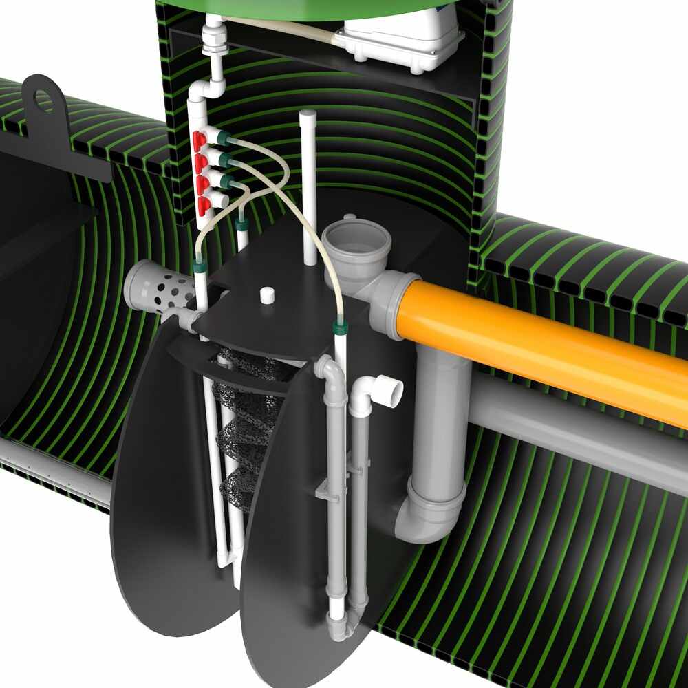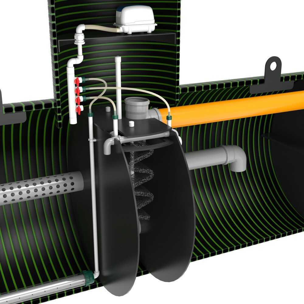 Принцип работы данного септика основан на мелкопузырчатой аэрации, которую создает аэратор (компрессор, воздуходувка), поставляемый в комплекте станции. За счет подачи воздуха в станцию, а также за счет дополнительных механизмов очистки происходит полная очистка хоз. бытовых стоков до уровня технической воды биологическим способом. Степень очистки станции при идеальных условиях достигает 98%. Вода на выходе не имеет запахов, абсолютно прозрачна и бесцветна. Такую, экологически чистую техническую воду можно достаточно долгое время дренировать в грунт, в канаву, дренажный колодец, в поле фильтрации. Вопреки всем мифам, в станцию не нужно добавлять никаких бактерий!