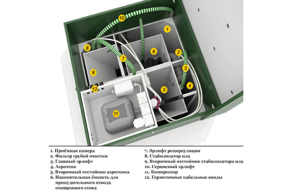 БиоДека-4 С-700 – аэрационный септик для частного дома с насосом для вывода чистой воды. Применяется в домах без центральной канализации: способен очистить стоки от унитаза, раковины, бытовых приборов и душа до состояния технической воды без запаха и цвета.