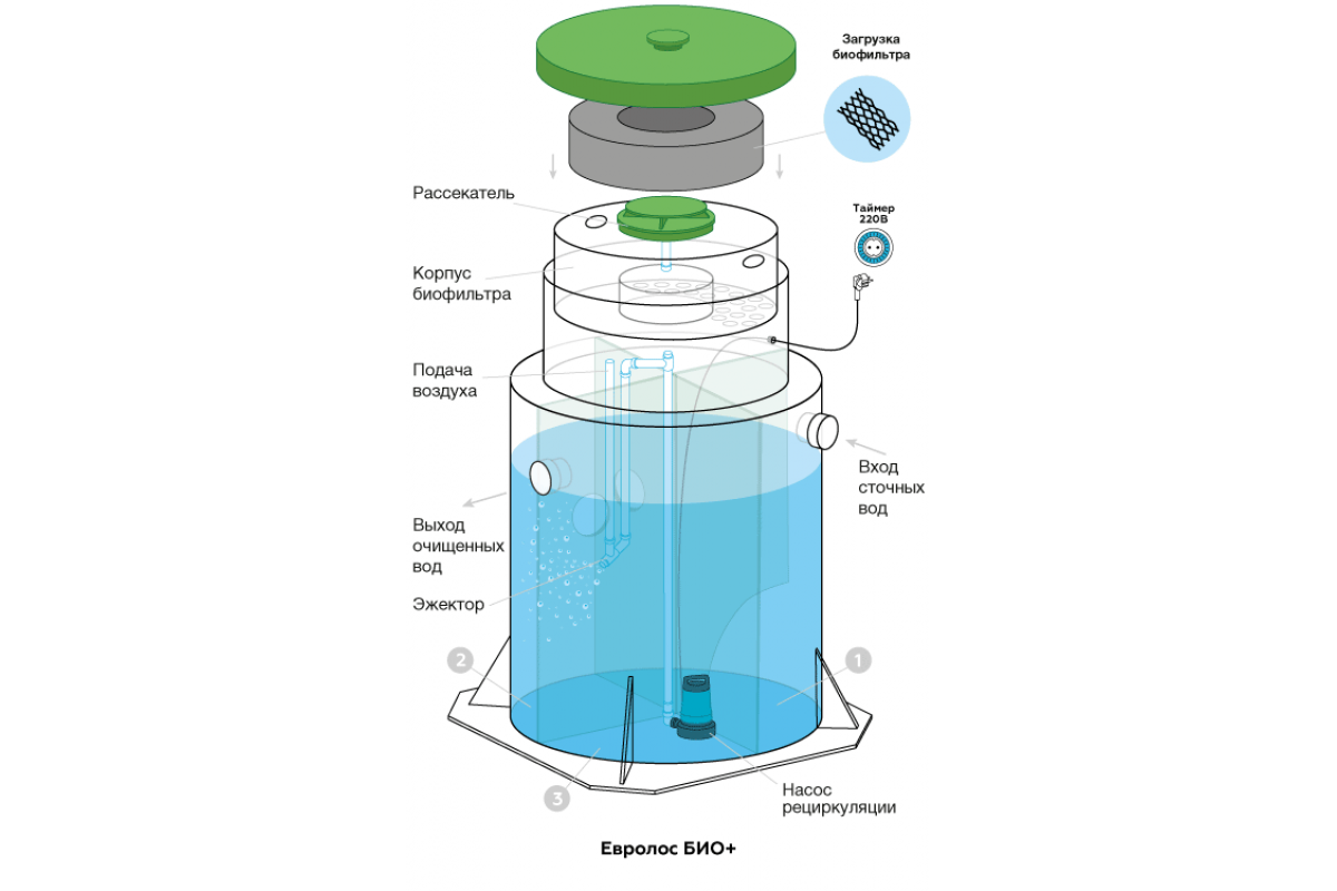 Локальное очистное сооружение (ЛОС) Евролос Био обеспечивает как грубую механическую, так и глубокую биологическую очистку канализационных сточных вод. Септик состоит из трех камер и биофильтра, расположенного в биореакторе — стоки циркулируют по этим камерам, неоднократно проходя через биофильтр. За одни сутки насчитывается 24 повторения цикла, в результате которых достигается очень высокая степень очистки воды, до 92-98%. Дальнейший сброс очищенной воды в дренажный колодец или в грунт не требует дополнительной доочистки стоков.