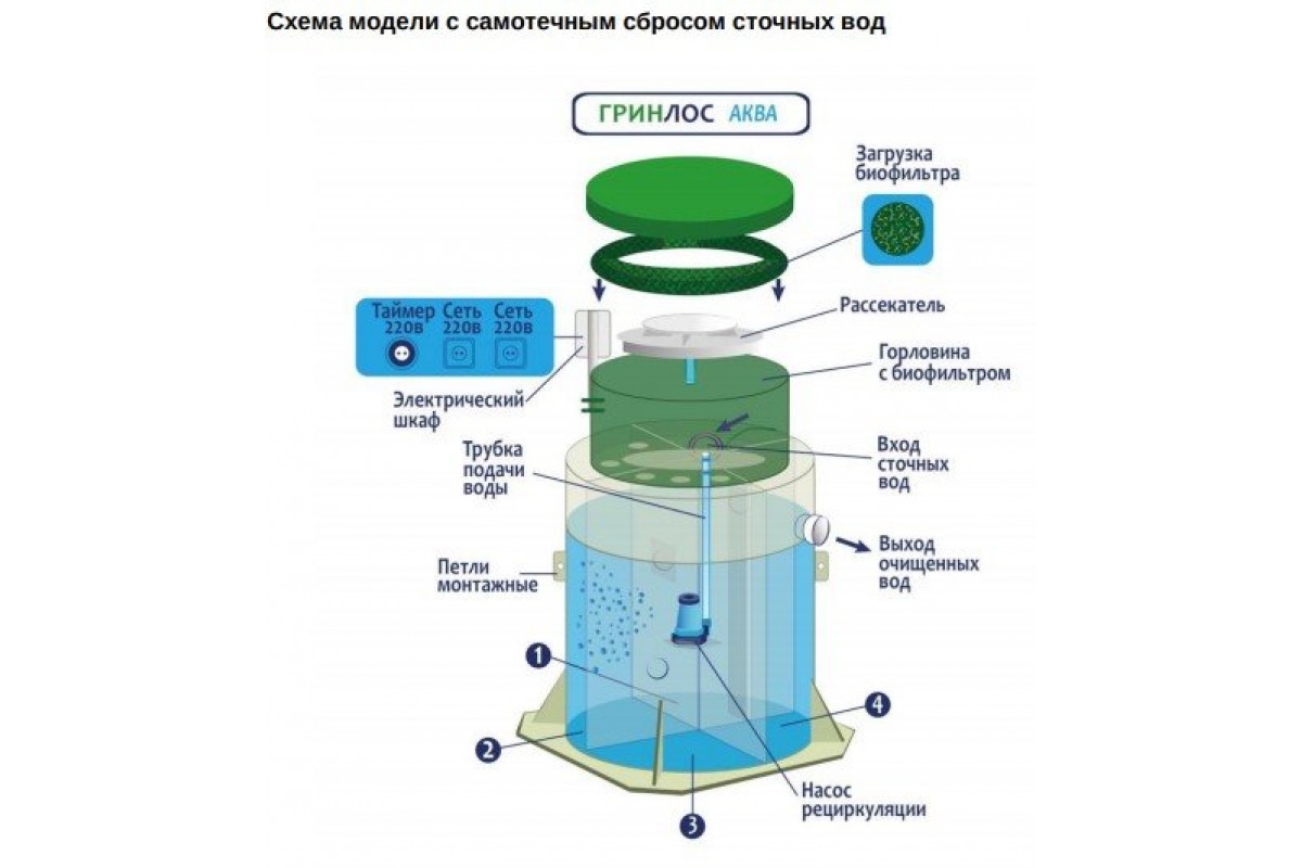 ГРИНЛОС Аква изготавливаются из вспененного полипропилена чешского производства. Нижний уровень разделен на четыре отсека со специальными технологическими переливами. Перетекая из одного отстойника в другой, стоки проходят первоначальный процесс отстаивания, усреднения стоков, отделения нерастворимых фракций (жиров и т.д.), которые остаются в первом отсеке. При этом уже в первом отсеке начинается очистка стоков свободным активным илом. Затем, из третьего отсека, стоки посредством дренажного насоса подаются на верхний уровень, на специальный разбрызгиватель, через который происходит орошение биофильтра.