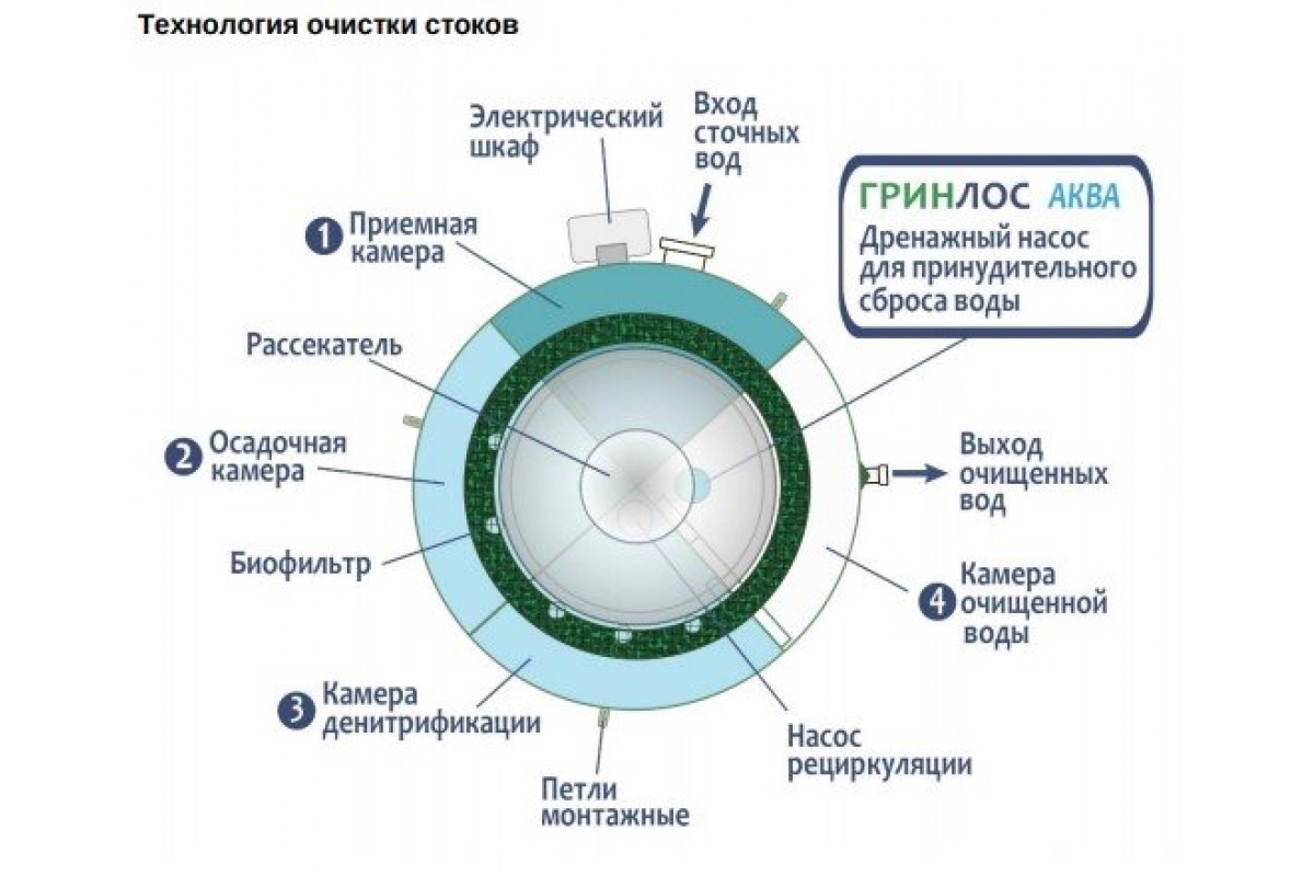 ГРИНЛОС Аква изготавливаются из вспененного полипропилена чешского производства. Нижний уровень разделен на четыре отсека со специальными технологическими переливами. Перетекая из одного отстойника в другой, стоки проходят первоначальный процесс отстаивания, усреднения стоков, отделения нерастворимых фракций (жиров и т.д.), которые остаются в первом отсеке. При этом уже в первом отсеке начинается очистка стоков свободным активным илом. Затем, из третьего отсека, стоки посредством дренажного насоса подаются на верхний уровень, на специальный разбрызгиватель, через который происходит орошение биофильтра.