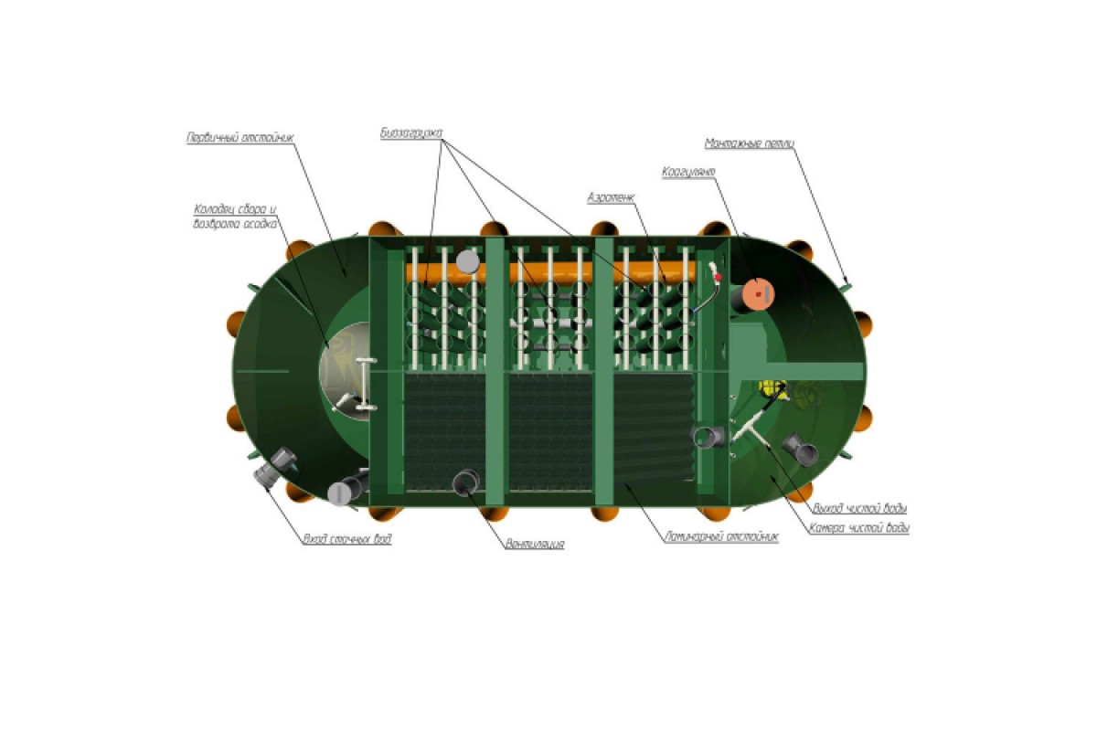 Сток поступает в приемную камеру-накопитель, где происходит накопление нерастворимых взвешенных веществ поступающих со сточными водами. Одновременно в данной камере происходят анаэробные процессы денитрификации, цель которых удаление азота из стока. Перелив в камере-накопителе расположен таким образом, чтобы сточные воды протекали с наименьшей скоростью, благодаря чему в каждой камере происходит оседание грубодисперсных взвешенных частиц на дно.