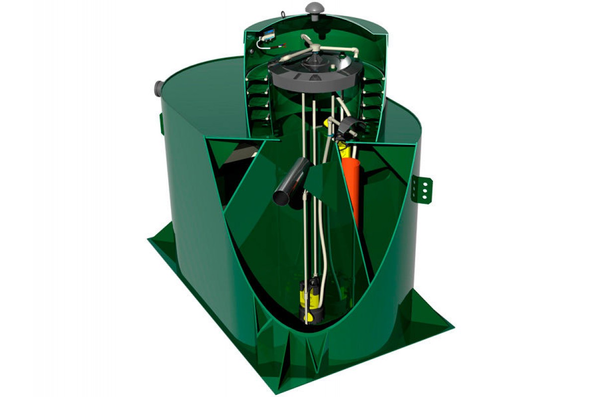 Очищенная вода удаляется в напорном режиме насосом из встроенного колодца (рассчитано на условия, когда невозможен отвод очищенной воды в самотечном режиме).