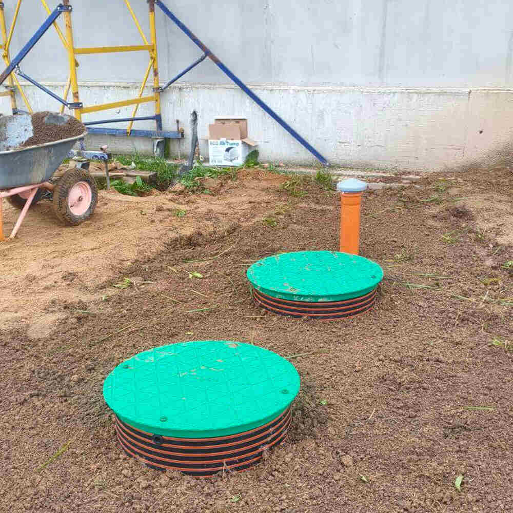 - Нижняя часть приемной камеры является иловым стабилизатором, где происходит конечное осаждение активного ила, эта камера является хранилищем всей переработанной твердой массы. Именно из этой камеры необходимо периодически удалять твердый осадок в ручную при помощи встроенного насоса, либо при помощи дренажного насоса, либо при помощи илососной машины (ассенизатора). Остатки взвешенного активного ила с поверхности камеры илового стабилизатора перетекают снова в приемную камеру, таким образом в системе поддерживается постоянная циркуляция активного ила, который играет ключевую роль в очистке стоков. Слой чистой воды образовываясь на поверхности в камере успокоителе вытекает через жироуловитель 2 самотеком из станции проходя дополнительную очистку через ершовую загрузку. Далее чистая техническая вода поступает в грунт при помощи дренажных систем (дренажного колодца, дренажных полей фильтрации, инфильтраторов)