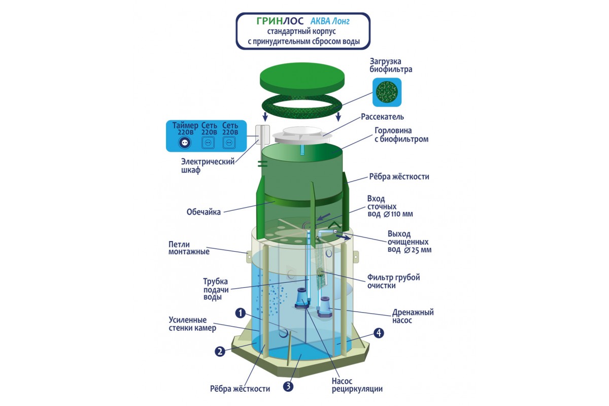 Также этот насос позволяет стокам насыщаться кислородом, что необходимо для поддержания жизнедеятельности бактерий. Все электрические элементы в септике ГРИНЛОС Аква Лонг ПР работают по таймеру, что позволяет значительно сэкономить на электричестве и увеличить временной интервал между обслуживанием септика.