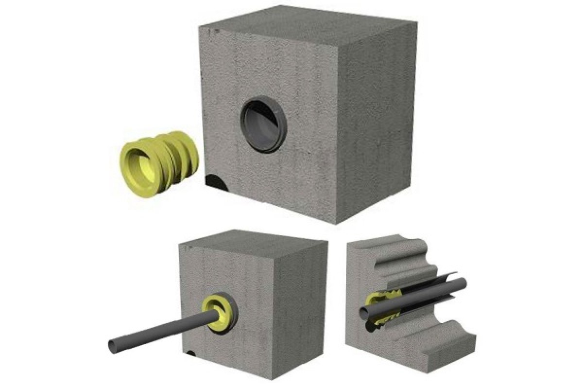 Фундамент или стена здания, наружная геометрия муфты точно повторяет, внутреннюю геометрию стандартной канализационной трубы диаметром 110 мм.